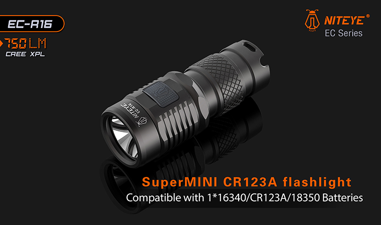 Niteye MS-R16 High End Series merupakan senter kelas enthusias dengan cahaya ekstreme dan performa high end. MS-R26 menggunakan Cree XP-L LED yang dapat menghasilkan output cahaya hingga 750 lumens. Niteye EC-R16 hadir dengan design body yang mini namun memiliki cahaya yang sangat terang. Sangat cocok digunakan untuk kegiatan sehari-hari. Dapat menggunakan baterai 1 x CR123A dan 1 x 16340. Niteye dilengkapi dengan circuit khusus yang berfungsi untuk mengatur penggunaan energy sehingga lebih hemat menggunaan baterai dibanding senter lainnya. Cicruit ini juga menjamin lifetime yang lama untuk senter Anda. Anda dapat mengganti mode senter dengan beberapa jenis tekanan ke tombol power ini seperti turbo, high, medium, low dan strobe mode. Tombol power ini juga memiliki lampu indikator untuk mengetahui kapasitas baterai yang tersisa. Senter ini Memiliki port micro USB sehingga Anda dapat langsung mengisi baterai melalui senter tanpa perlu melapas pasang baterai.