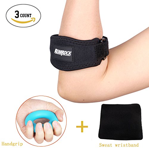 vEXTRA BONUS The elbow brace comes with a sweat wrist band and silicone hand grip, you will get 3 in 1 purchase. The 40-lb silicone hand gripper is used to strengthens the muscles and tendons in your arm to prevent future painful issues