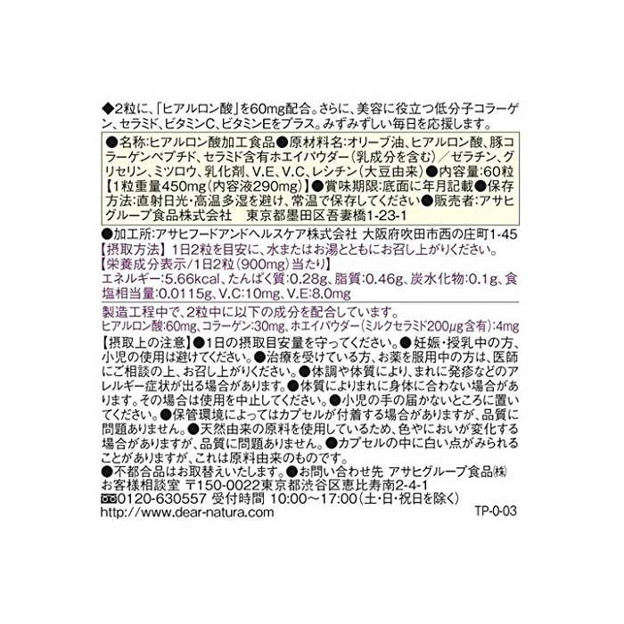 원재료 : 올리브유,히알론산,돈콜라겐 펩티드,세라미드 함유《호에이파우다》(유제품)고, 젤라틴,글리세린,《미츠로우》,유화 제,V.E,V.C,레시틴(대두 유래)