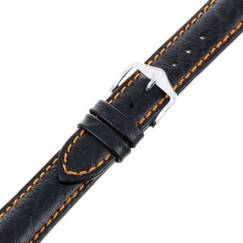 -. Feature : Genuine textured calfskin with colored contrast stitching and a soft glove lining leather / Remborde construction; l length=120x80mm; 18m wide at lug end & 16mm wide at buckle end / Buffalo embossed calfskin with orange colored contrast stitching / White buckle / Water resistant