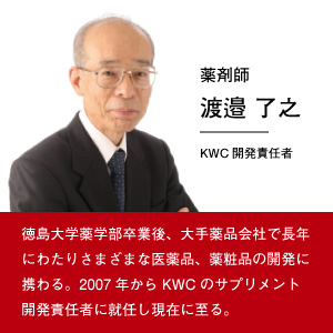 徳島大学薬学部卒業後、大手薬品会社で長年にわたりさまざまな医薬品、薬粧品の開発に携わる。2007年からKWCのサプリメント開発責任者に就任し現在に至る。