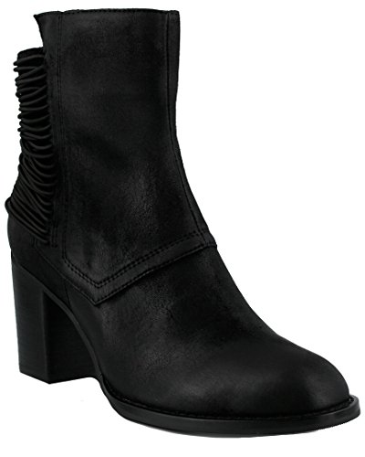 Product DescriptionChunky heeled bootie styled with elastic lacing detail.0
