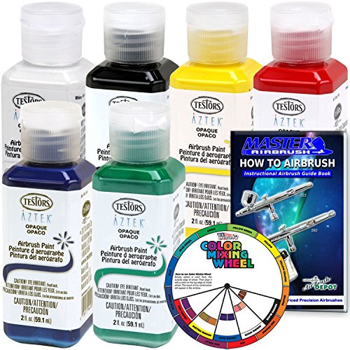 6 Color - Testors Aztek Premium Opaque Semi-Gloss Acrylic Airbrush Paint Set with Color Mixing Wheel and How to Airbrush Manual