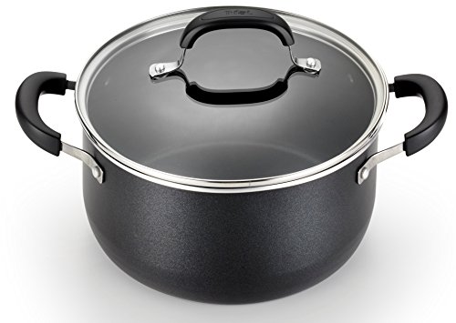 It comes with upgraded new T-fal Thermo-Spot heat indicator shows when pan is perfectly preheated to seal in the flavor of your food. The Titanium reinforced nonstick coating is T-fal's most durable nonstick, yet. The set includes: 8" Fry Pan, 11" Covered Fry Pan, 1 quart Covered Sauce Pan, 2 quart Covered Sauce Pan, 5 quart Covered Dutch Oven, Stainless Steel Flower Steamer, Nylon Slot Spatula & Spoon.