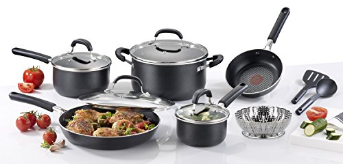 T-fal C085SC74 OptiCook Thermo-Spot Titanium Nonstick Dishwasher Safe Oven Safe Fry Pan Cookware Set, 12-Piece, Black