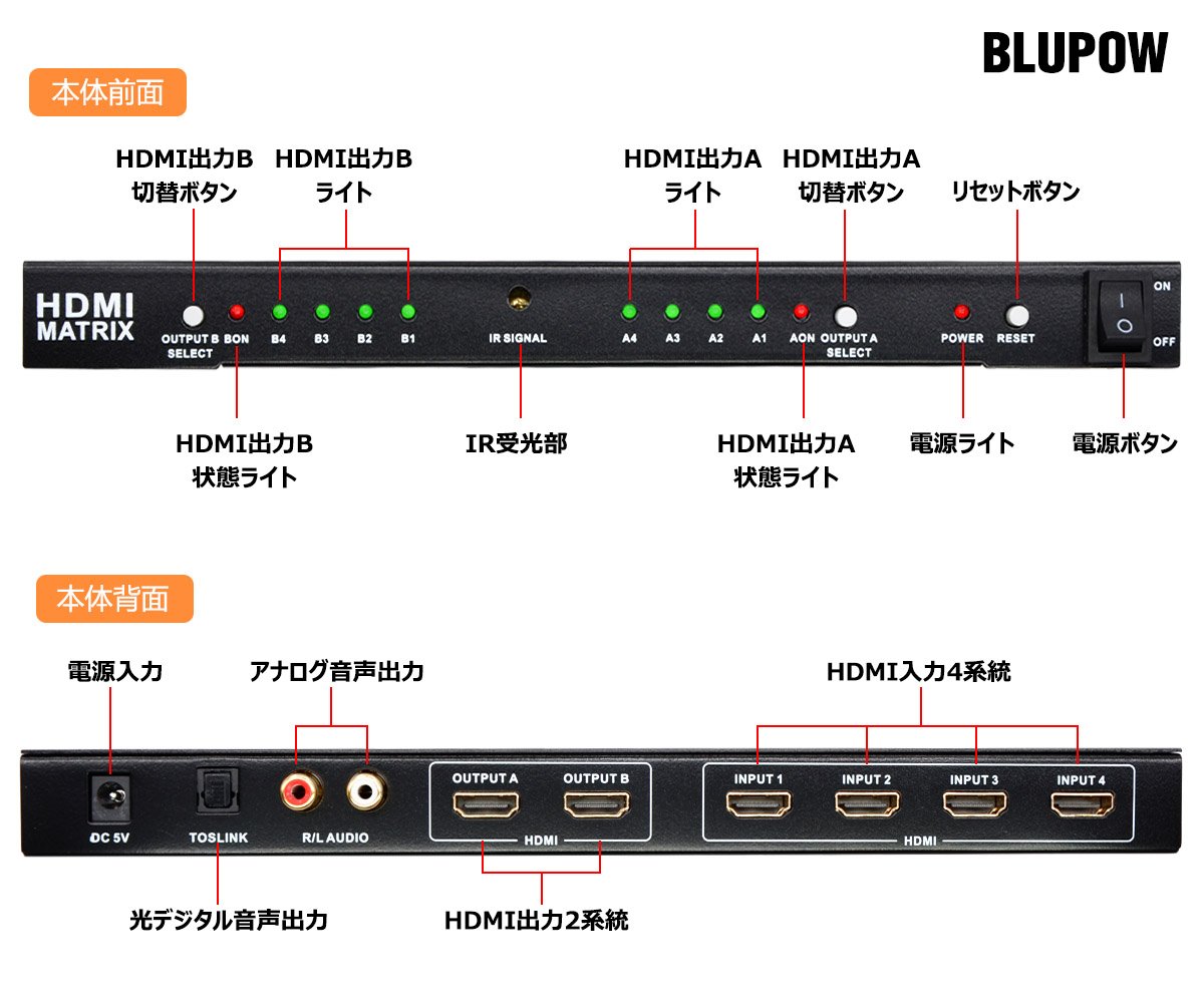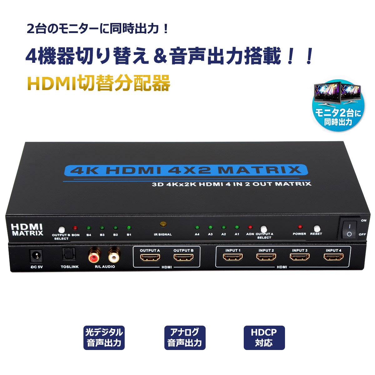 This machine is an HDMI matrix that switches 4 video / audio and outputs the beauty of high definition 4K video as it is to 2 televisions, displays, projectors and so on.