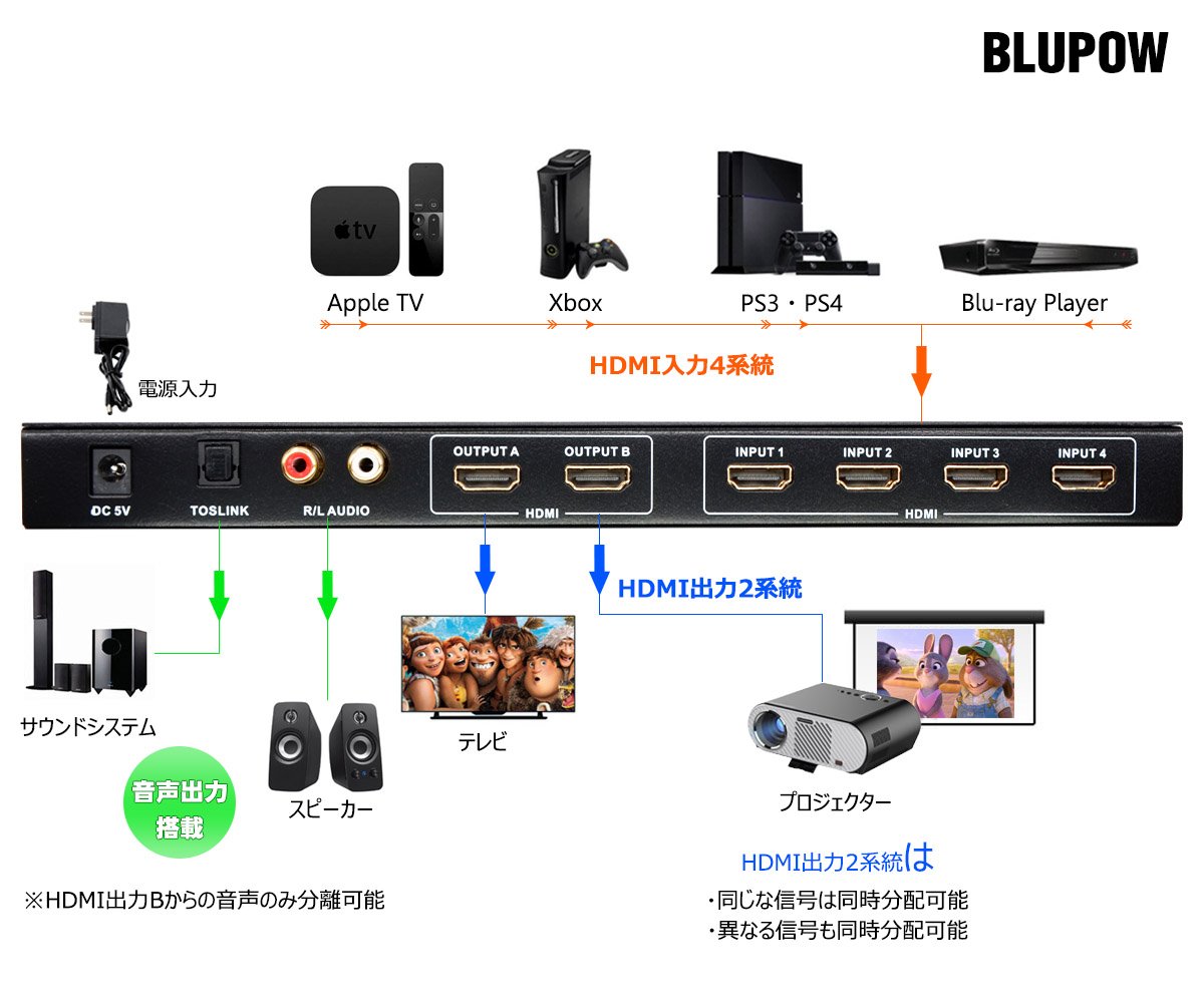 ● HDMI output such as HDD recorder, Blu-ray player, projector, TV BOX, PC, HD DVD, PS4 · PS3, XBOX, Apple TV etc Suitable for switching distribution and audio separation of certain equipment.