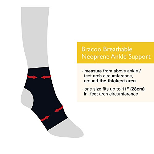 -. Binding : Sports -. Brand : Bracoo -. Color : Black -. Department : unisex-adult -. EAN : 0854194003121 -. Feature : Open heel design allows wide range of motion during activity and still provide support for the ankle tendons and joints / Ideal for speeding up the recovery period for chronic and acute ankle injury symptoms, protects the ankle and minimize the risk of injury / Contour design for custom adjustments to fit feet arch and ankle shape / Breathable neoprene material retains heat and prevents skin irritation / One size fits both feet and up to 11" in feet arch circumference -. IsAdultProduct : 0 -. Label : Comfylife Inc. -. Manufacturer : Comfylife Inc. -. Model : Y76540 -. MPN : 76540 -. PackageQuantity : 1 -. PartNumber : 76540 -. ProductGroup : Sports -. ProductTypeName : HEALTH_PERSONAL_CARE -. Publisher : Comfylife Inc. -. Size : One Size -. Studio : Comfylife Inc. -. Title : Bracoo Breathable Neoprene Ankle Support, One Size, Black -. UPC : 854194003121