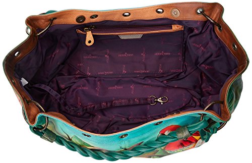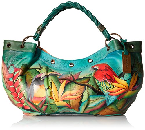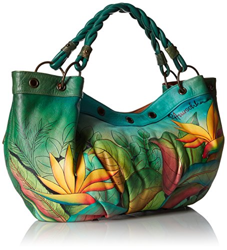 Anuschka Handpainted Leather Braided Handle Large Ruched Hobo Tropical Bliss