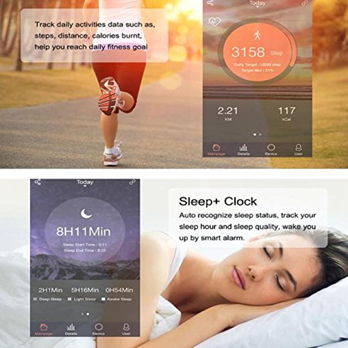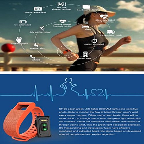 -. Feature : ealth Tracker: Heart Rate Monitor, Pedometer, Calories Counter, Distance, Sleep Monitor / Activities record:Record daily activities,you could daily activities including steps,distance and calorie consumption in the app / Sleep monitoring:Device could automatically recognize your status and monitoring the whole sleep progress with analyzing the deep sleep and light sleep hours; / Anti-lost:When the smart phone is beyond the bluetooth range(no more than 5m),the device vibrates to remind. / Remote camera control:Device key could control remote photograph shooting.