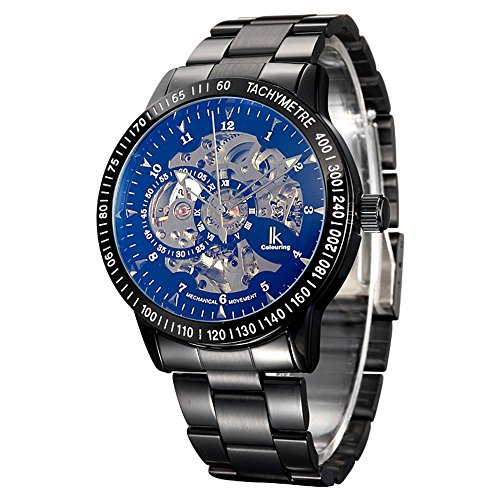 -. Feature : IK colouring Black Steel Mechanical Watch for Men / Black Watch Dial with Coated Glass. Luminous Hands / ALL Black Steel Watch Case and Watchband, Fold-over-clasp with IK Colouring Brand Logo / Skeleton Hollow-out Watch Dial. See-through. The tachymeter bezel only for decoration / Water Resistance 1 ATM (splash proof). Come with GuTe minimalist Watchbox ECO-friendly with Simple Instruction