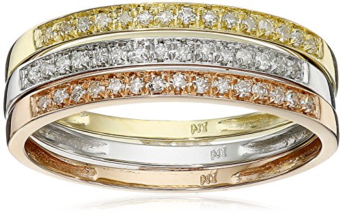 Catch the trend of stacking rings with this fun set of white, yellow and rose-gold diamond rings. Displayed at the top of each 10k gold band is a display of 15 prong-set diamond stones that reveal J-K color and I2-I3 clarity. When all three rings are worn, they make up 1/4 cttw. Wear one ring on any finger for a classic, understated look; multiple rings on multiple fingers to try something new; or all three rings on one finger to make a fashionable and sparkly statement.Feature