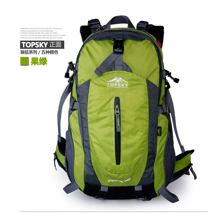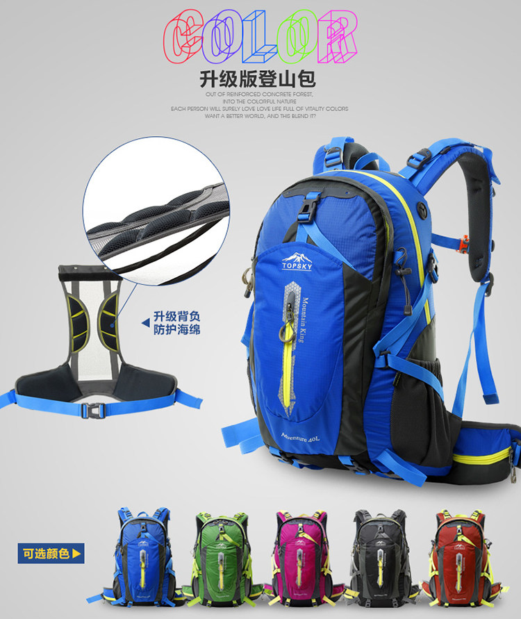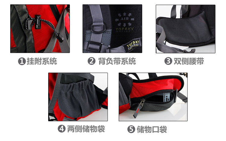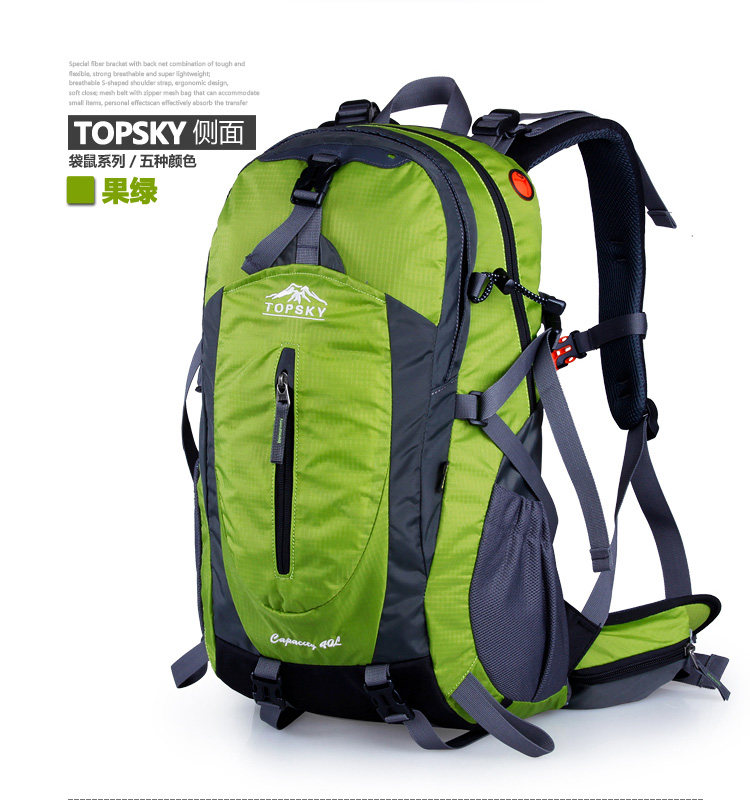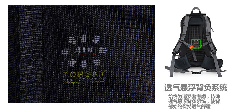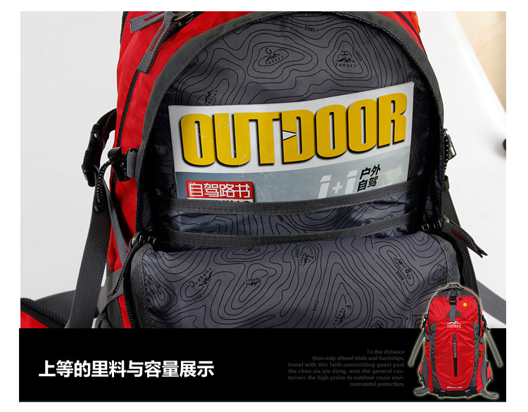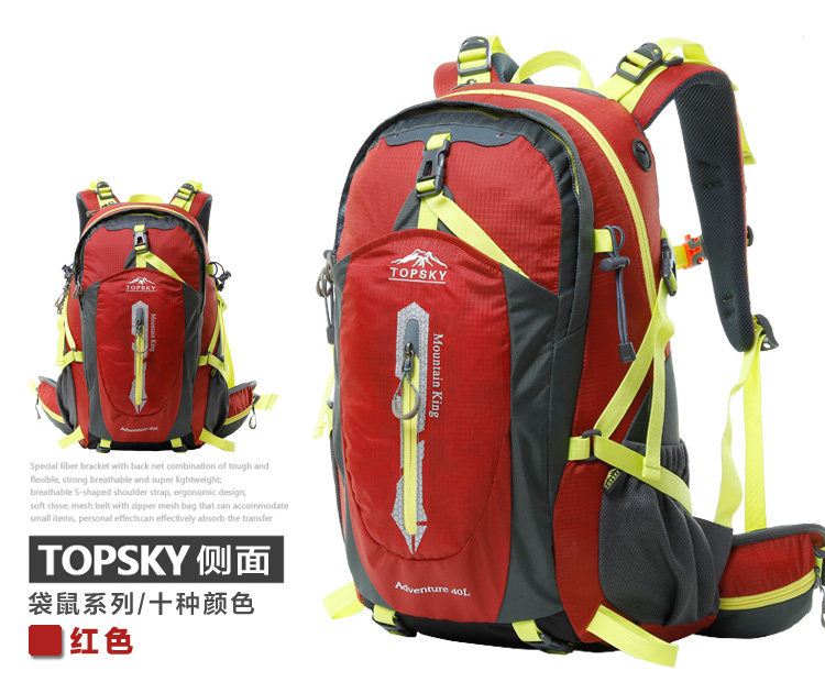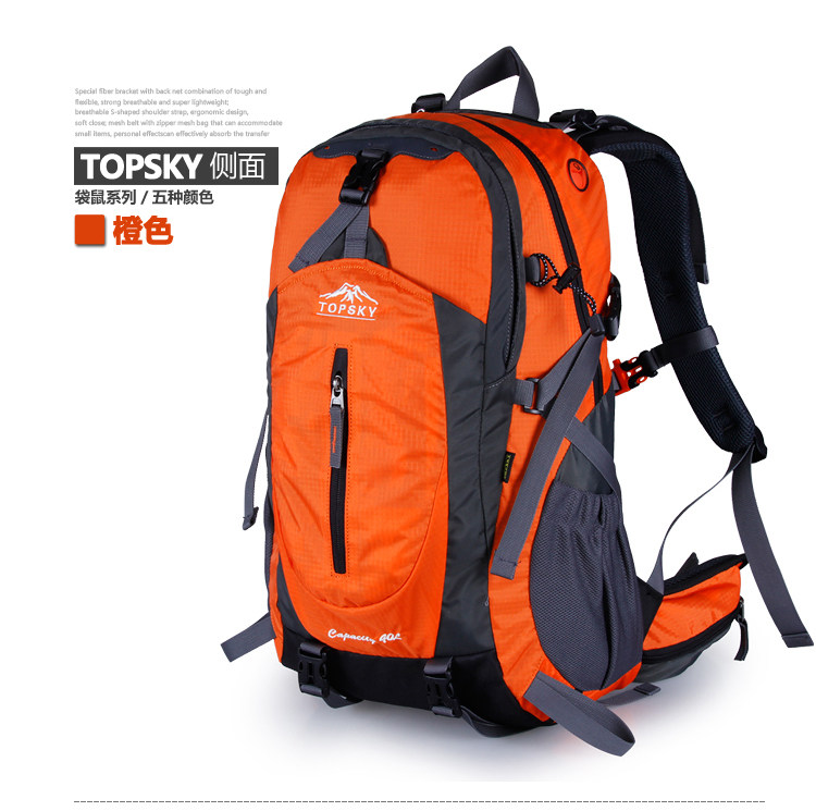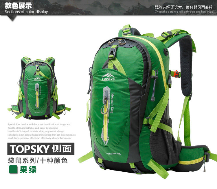 Product parameters: Time to market:2014summer Aremallsthe same paragraph: Yes Item No: T33601 Capacity: 36L (including) -55L (including) Time to market:2014summer Material:Nylon Pricetag: 399 Carrying system: Resin net made in China To apply a gender: unisex Color Classification: blackfruitredgreenblueorange Applicablescene: Professional mountaineering Carrying systemstructure:within theframepackage Capacity: 40L 50 升 Brand: Topsky / traveloff Dimensions: 40L 50L Whetherequipped withrain cover: Yes Is there akettlereservedwarehouse: Yes ProductSeries:Mountaineering bag