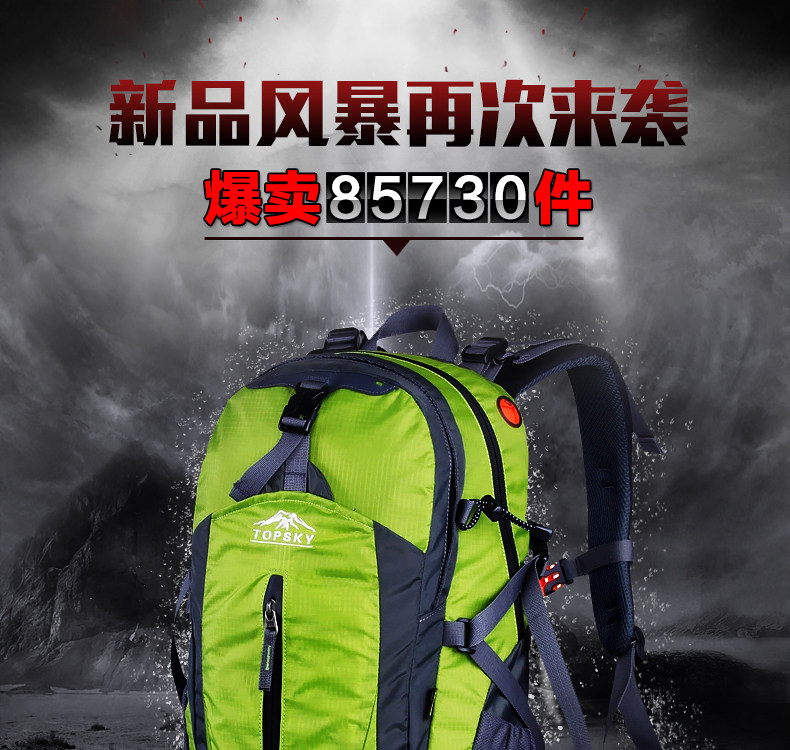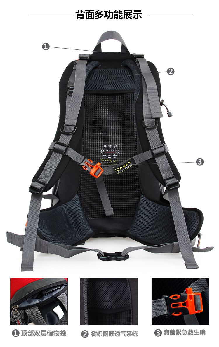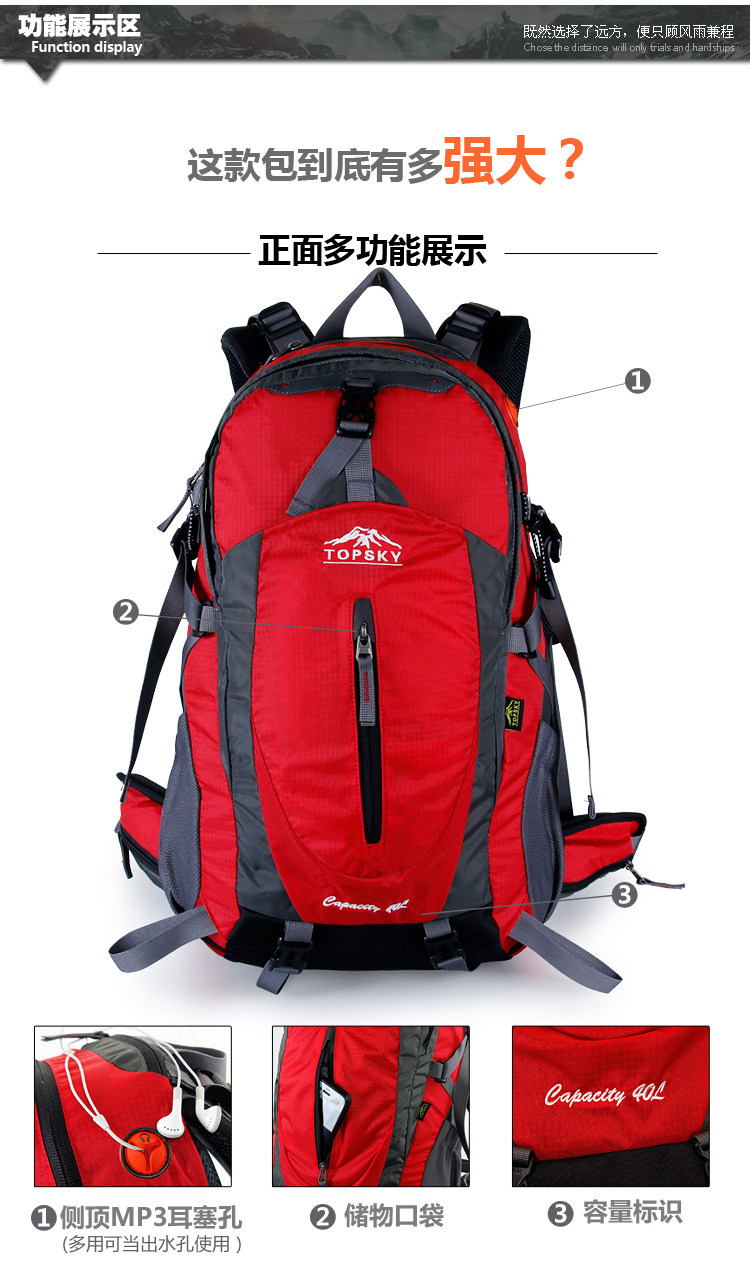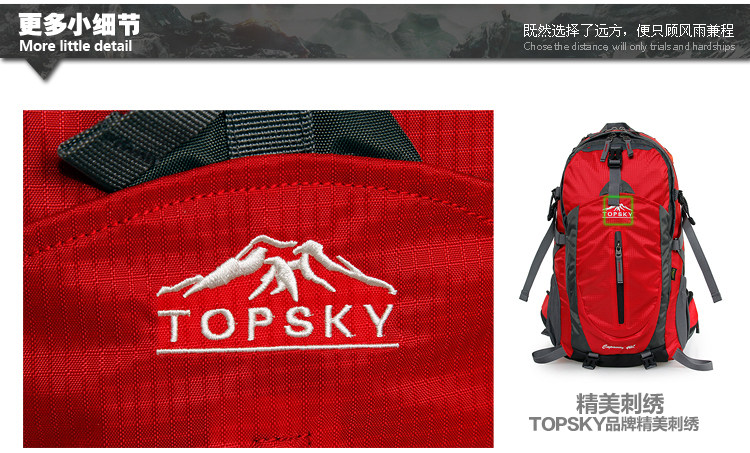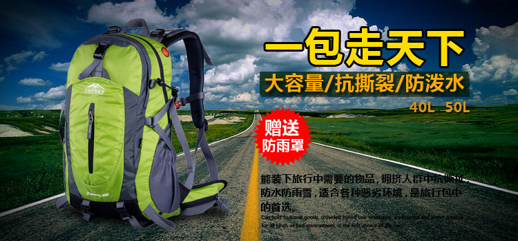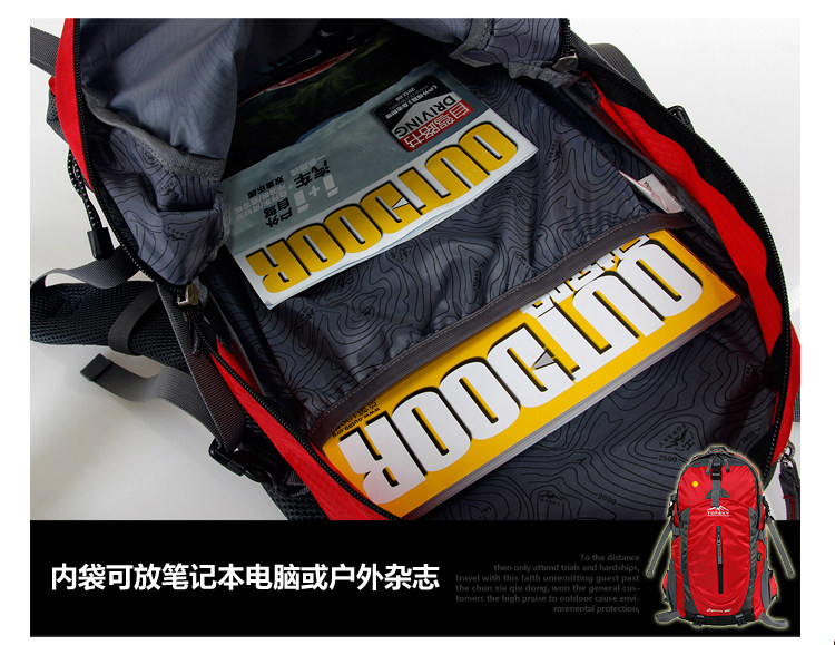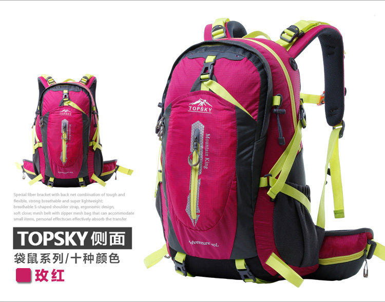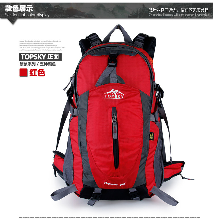 Product parameters: Time to market:2014summer Aremallsthe same paragraph: Yes Item No: T33601 Capacity: 36L (including) -55L (including) Time to market:2014summer Material:Nylon Pricetag: 399 Carrying system: Resin net made in China To apply a gender: unisex Color Classification: blackfruitredgreenblueorange Applicablescene: Professional mountaineering Carrying systemstructure:within theframepackage Capacity: 40L 50 升 Brand: Topsky / traveloff Dimensions: 40L 50L Whetherequipped withrain cover: Yes Is there akettlereservedwarehouse: Yes ProductSeries:Mountaineering bag
