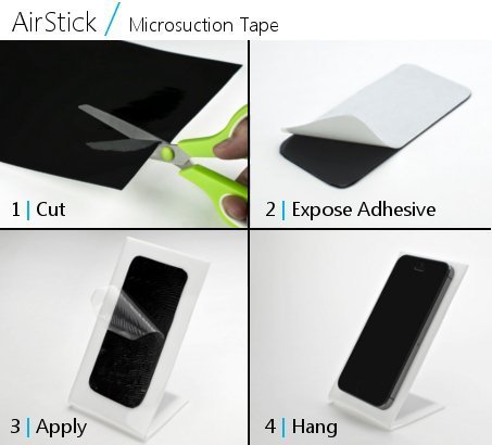 The incredible AirStick Microsuction Tape used on the MOS and MOS Reach is now available for you to use anywhere. AirStick tape bonds to any smooth, flat, clean surface without leaving any kind of sticky residue. The surface of the tape has thousands of microscopic air pockets that create partial vacuums between the tape and the target surface. It isn't pressure sensitive and leaves no residue behind. It can also be used repeatedly without losing its holding power. If your tape loses some of its bonding power, simply wipe it with a damp cloth to remove the dust and it will work as good as new. To remove an object from AirStick tape, you simply pull or twist the object to break the vacuum bond. Once in place a 4" x 1" piece of tape can hold a 1 pound piece of steel. The reverse side of the tape is covered in an acrylic adhesive for a more permanent bond with your base surface. You can apply the adhesive to a phone dock, a desk, dashboard, or anywhere else where you need a little extra holding power. This tape is perfect for designers, your desk, your car dashboard, secret agents who climb tall glass buildings (or anyone aspiring to be like one), and Spiderman wannabes.Feature