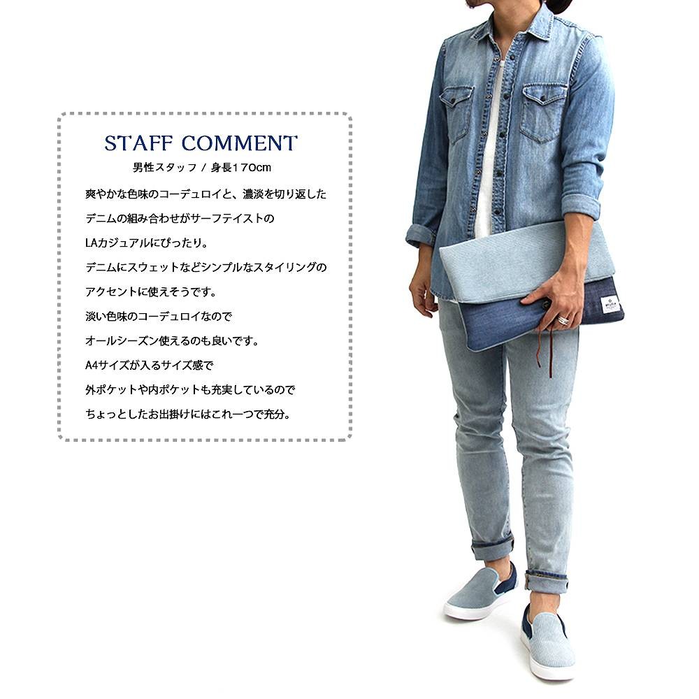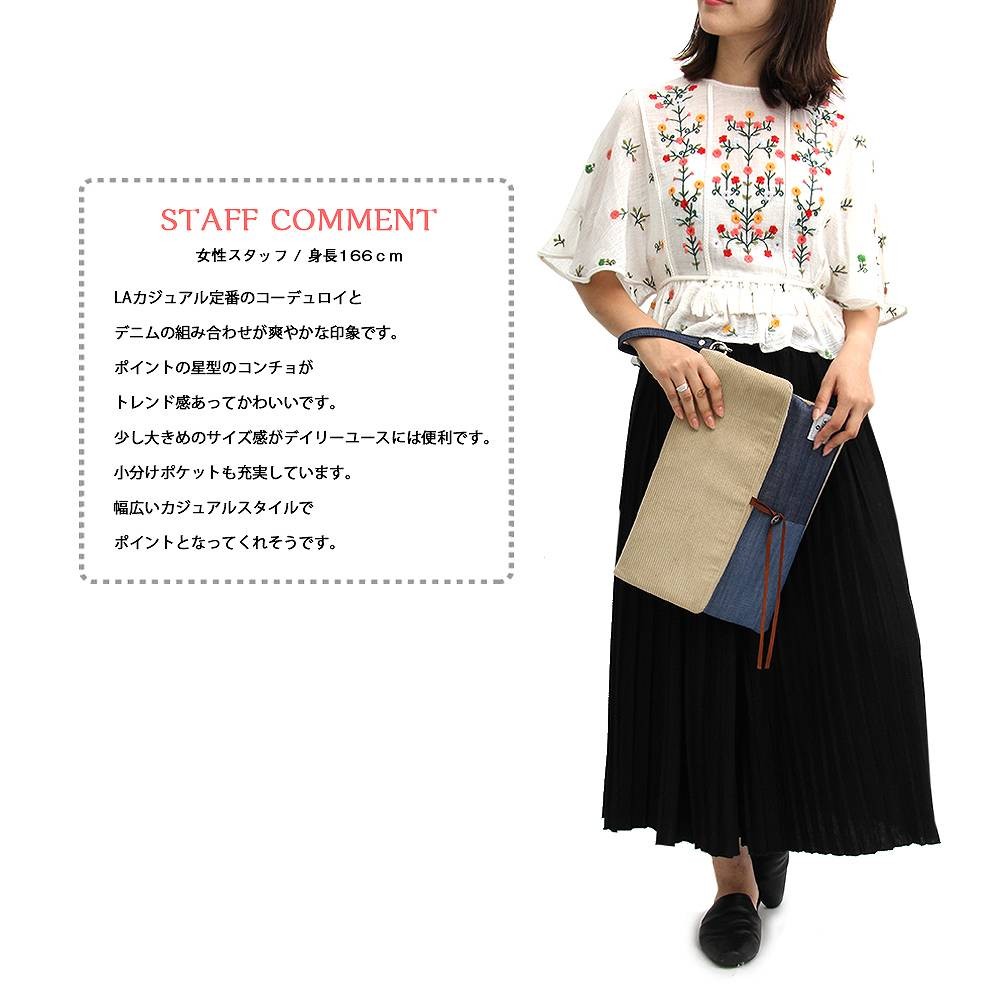 | 商品説明 | ”コーデュロイとデニムでLAカジュアルを表現したクラッチバッグ” 太畝のコーデュロイとデニムのコンビネーションがサーフスタイルに合うクラッチバッグ。 秋冬の定番素材のコーデュロイを使用しながらも、淡い色味をチョイスすることで、 どのカラーも爽やかな色味でオールシーズン使える仕上がり。 淡い色味のコーデュロイとデニムをコンビにしたことで、西洋海岸の雰囲気を感じる表情に仕上げた。 また、異素材のコンビネーションは、表情にメリハリが生まれ、コーディネートのポイントに。 アクセントのコンチョボタンとレザー調の巻き紐を使ったネイティブなこなしもポイント。 星型のオリジナルコンチョを使ったことで、トレンド感をプラスしたデザインに。 |