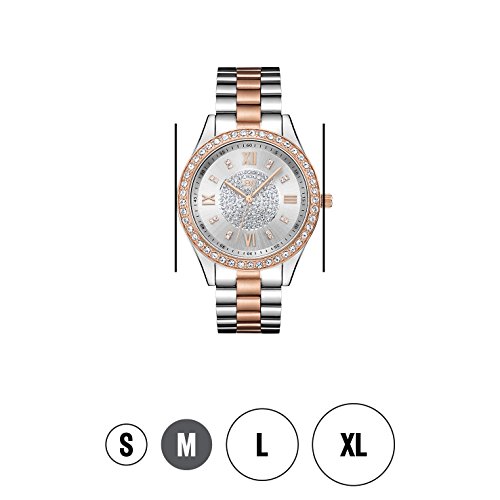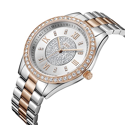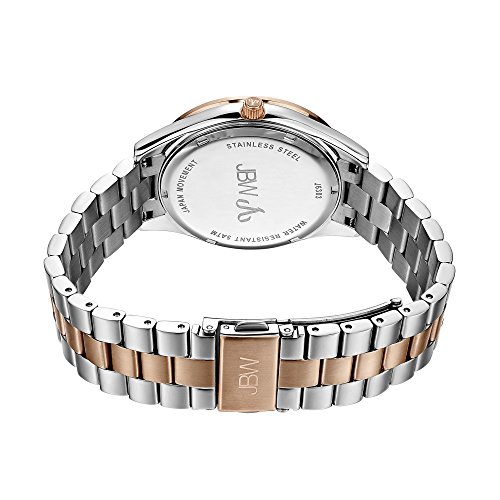 18k rose gold-plated stainless steel bezel with 24 genuine diamonds and two tone rose gold and stainless steel three link metal band