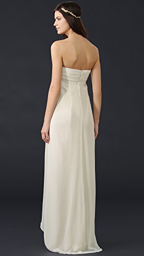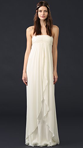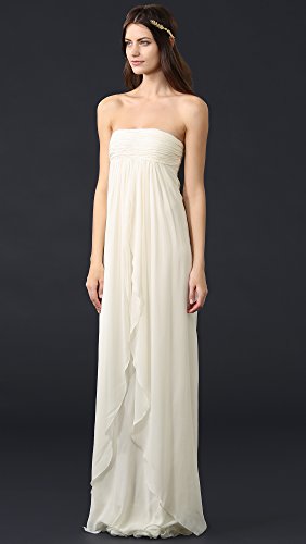 A graceful Rachel Zoe gown with an elegant empire waist. Draped overlays create airy volume, and the serged hem forms a dainty, ruffled edge. Nonslip rubber binding structures the strapless bodice. Hidden back zip. Lined.