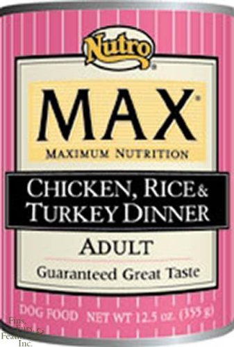 Max adult chicken, rice and turkey dinner dog food cans are formulated for any size dog ages 1-7 years old.