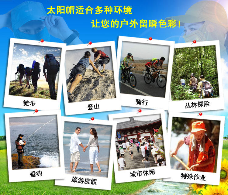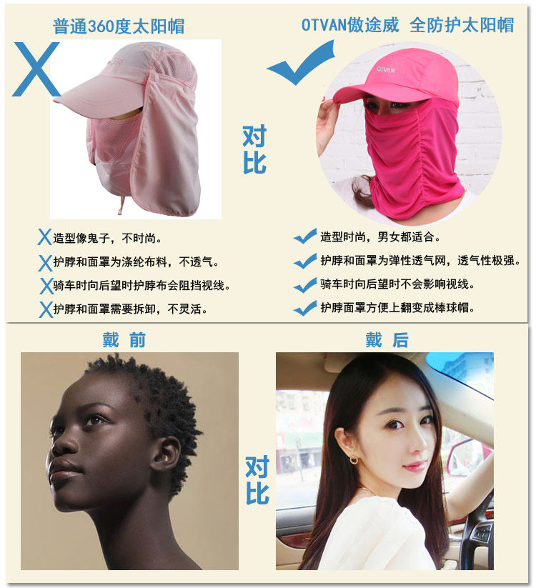 此款360度全防护太阳帽,款式时尚大方,全面防紫外线,防过敏,用途多样,可用于户外登山、日常骑车、丛林探险、旅游休闲徒步、钓鱼等均可发挥作用。比一般的鬼子帽更加时尚,更加透气,特别是解决了一般鬼子帽在骑车时回头时被披肩遮挡视线的问题,是专业驴友或者日常上班族的夏天必备品!