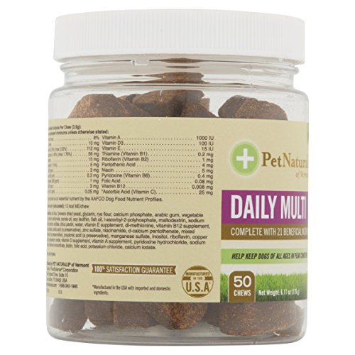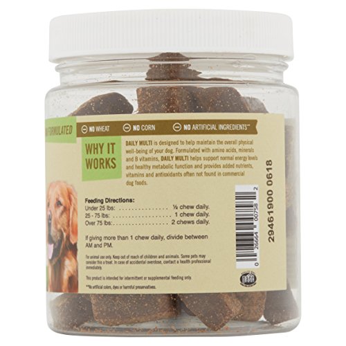 Daily Multi for dogs is an easy way to make sure that your pet is getting all the daily vitamins and minerals that keep them healthy and in peak condition. Our multivitamin for dogs provides essential fatty acids and antioxidants that can be degraded in common pet foods. Daily Multi is also a great addition to a homemade or raw fed diet. Instead of treats with empty calories, offer your dog a delicious soft chew packed with nutrition that they'll love. Feeding Directions: Under 25 lbs: . . . . . . . . . . . . . . . . . . ½ chew daily. 25 - 75 lbs: . . . . . . . . . . . . . . . . . . . . . 1 chew daily. Over 75 lbs: . . . . . . . . . . . . . . . . . . . 2 chews daily. If giving more than 1 chew daily, divide between AM and PM.Feature