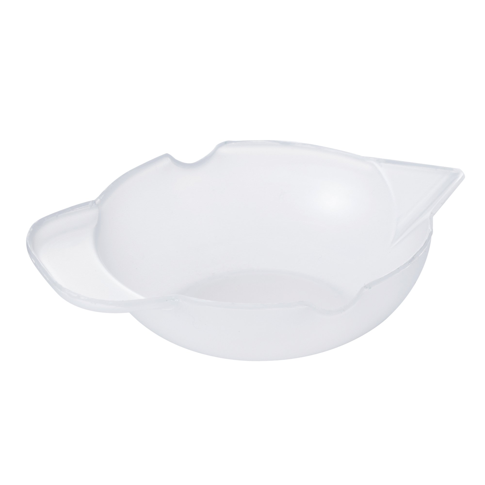 It is a translucent, bowl-shaped palette with a handle and pour spout.