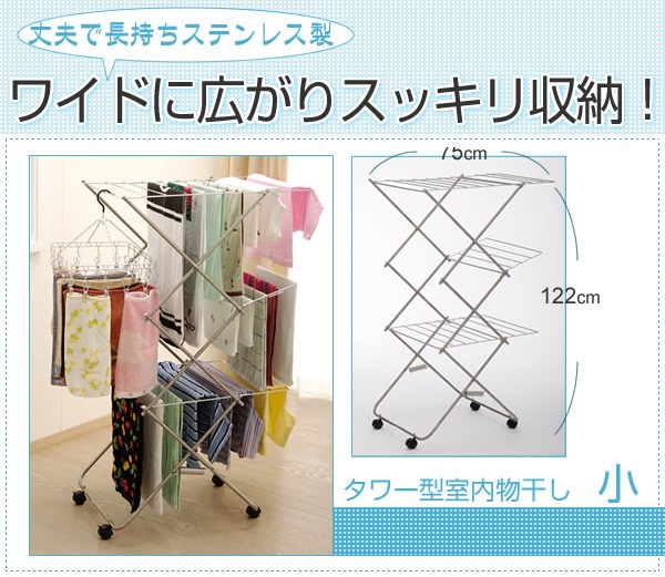 丈夫なステンレス製のタワー型室内物干し!簡単組立てでワイドに広がり、キャスターでスイスイ移動可能!さらにコンパクトにスッキリ収納できます☆たっぷり干せて使いやすい機能的な室内干しです!製造国:日本 商品サイズ/使用時:約巾57×奥行75×高さ122cm 収納時:約巾57×奥行81×高さ11cm 重量:約4.3kg 素材・材質:ステンレス鋼 ※サプライヤー直送品 ご注文後3~4営業日後の出荷となります【商品名】タワー型室内物干し 小