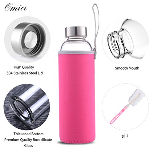-. Title : OMICE Glass Water Bottle BPA-Free Top Quality Borosilicate Glass 18 oz with Stainless Steel Leak-proof Cap, Nylon Sleeve and Gift Sponge Brush