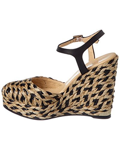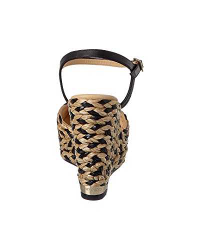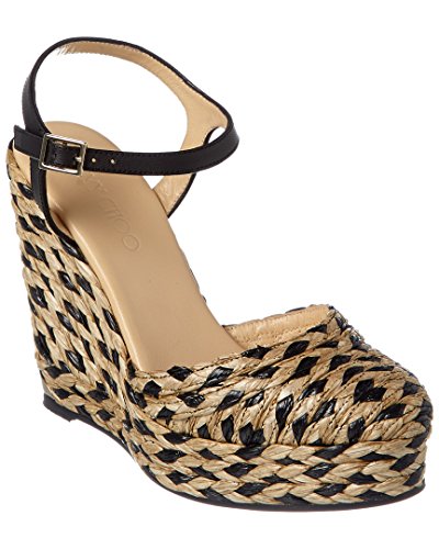 Studio : Jimmy Choo Publisher : Jimmy Choo Binding : Apparel Product Description Please note: Size selections are European. For US conversions, please reference size chart.. Made in Italy. Color/material: black and natural woven raffia. Design details: gold-tone hardware. Adjustable ankle strap with buckle closure. Lightly padded leather insole. Smooth leather sole. 4.75in heel. 1in platform. Please note: All measurements are approximate and were taken from a size 37; slight variations may occur. 0
