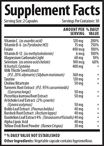 Our unique blend of liver-friendly ingredients includes: -Milk Thistle Seed Extract (Silymarin) -N Acetyl L Cysteine (NAC) -Turmeric Root Extract -Choline Bitartrate -Artichoke Leaf Extract -Boldo Leaf Extract -Burdock Root Extract -Dandelion Leaf Extract -Alpha Lipoic Acid -Yellow Dock Root Powder -And more!