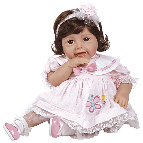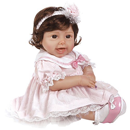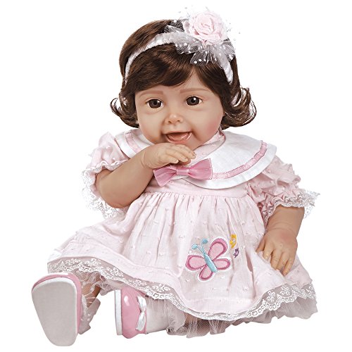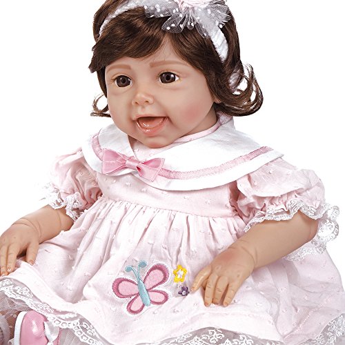 - Feature : Realistic baby doll measures 20 inches from head to toe, with silicone like Flex-Touch vinyl head and limbs and a weighted body for a real baby feel / Silicone like Flex-Touch Vinyl is "soft as a baby's bottom" providing a delicate texture and realistic skin tone. The arms and legs are made from pure Flex-Touch Vinyl while the head is created in a remarkable 2 step process giving it the effect of a delicate skin on the facial features. / Beautiful hand set big brown eyes, hand painted details, hand applied eyelashes and gorgeous brown hair / Renowned artist Jen Printy has created our first ever giggling doll "Tickled in Pink", a wonderfully lifelike baby doll with big brown eyes with the slightest indent beneath them that really bring out her cheeks just like a real infant! / 3/4 Vinyl arms & 3/4 Vinyl legs