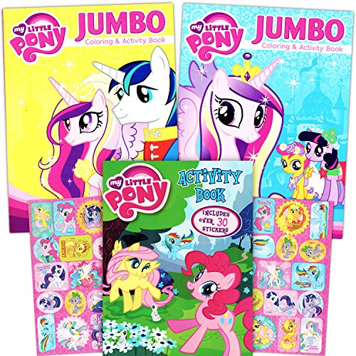 [Description] Delight your My Little Pony fan with this My Little Pony coloring book super set with stickers! My Little Pony coloring and activity book set with your favorite characters from My Little Pony including Rainbow Dash_ Fluttershy_ Pinkie Pie_ Twightlight Sparkle and more! These My Little Pony coloring books will provide many hours of fun with games_ puzzles_ mazes and coloring activities. Set of 3 My Little Pony coloring books -- one My Little Pony Activity Book (32 pages with over 30 My Little Pony Stickers)_ and two jumbo My Little Pony coloring book (approximatley 96 pages)--a total of approximately 200 pages of coloring fun and over 30 stickers! My Little Pony coloring books measure approximately 8 x 11 inches. Great gift for your favorite My Little Pony enthusiast! This coloring and activity book set will provide many hours of learning and fun! Perfect as My Little Pony party supplies and party favors.