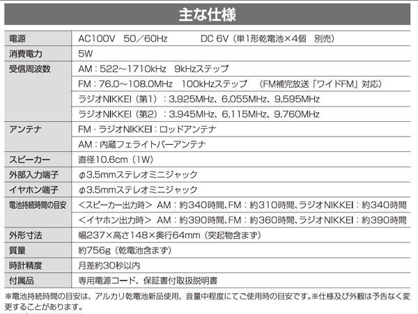 | AM、FM、ラジオNIKKEIが受信できます。ワイドFM(FM補完放送)対応です。ワンタッチ選局、オートスキャン(自動一括登録)機能、アラーム・スリープ・クロック機能、誤作動防止ロック機能搭載。コンセントでも乾電池でも使用できる2電源仕様です。 |