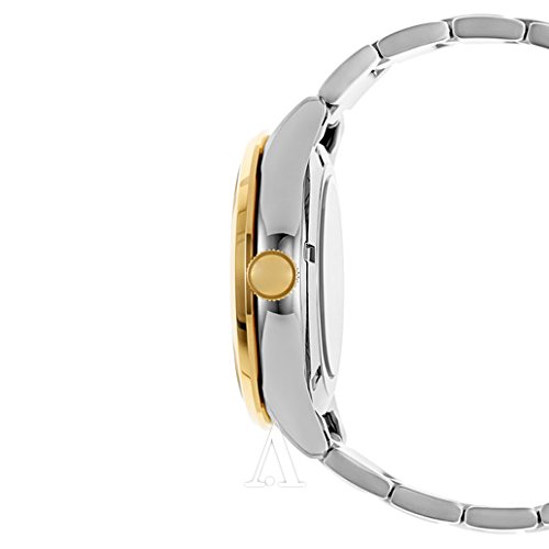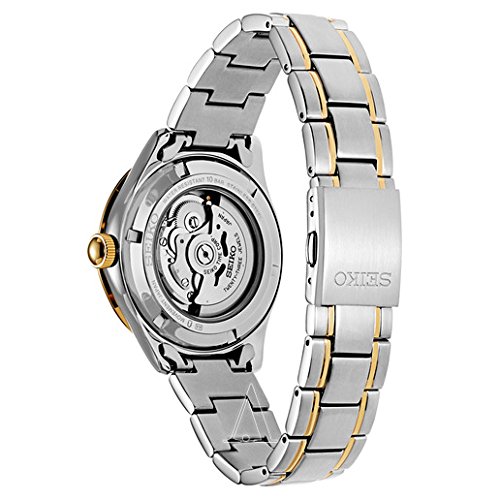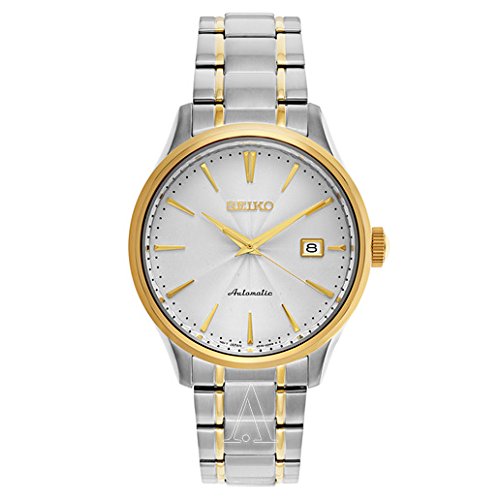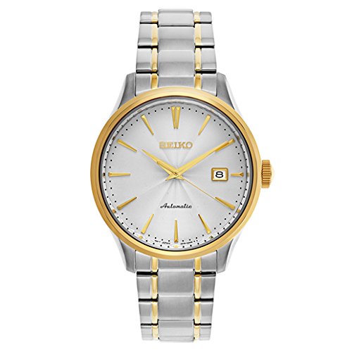 Seiko SRP704 Core men's automatic watch features a 42mm wide and 12mm thick two tone yellow gold plated solid stainless steel case with a fixed bezel and textured push-pull crown. Seiko SRP704 is powered by 4R35 automatic movement with 23 jewels. This stylish watch also features a textured sunray milky white dial with gold tone luminous hands and index hour markers along with the power reserve: approximately 41 hours, 21,600 vibrations per hour and date display functions, scratch resistant hardlex crystal and water resistant to 100 meters. Seiko SRP704 is equipped with a two tone yellow gold plated solid stainless steel bracelet with a fold over push button clasp. Seiko SRP704 men's Core two tone steel white dial power reserve automatic watch is brand new and comes in an original Seiko gift box and is backed by a 3 year for USA and 1 year international store limited warranty.Feature