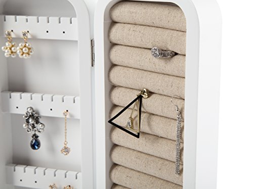 The two sides can bracelets and rings,one side can put earrings,one side and three hooks can put necklaces.