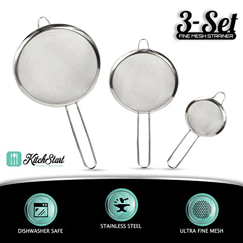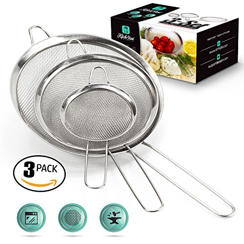 •HIGH QUALITY DESIGN: With the KITCHSTART 3MS MESH STRAINERS, they are made with storage in mind in that they can be stacked safely or hung without damaging the mesh liners; while the smallest one can be used to drain tea, coffee, pulp juices, or gravy, the medium size can be used as a colander or skimmer for rice, pasta, noodles, veggies, fruit, and yogurt, and the large one is a sifter or sieve for flour, salad, oils, et cetera