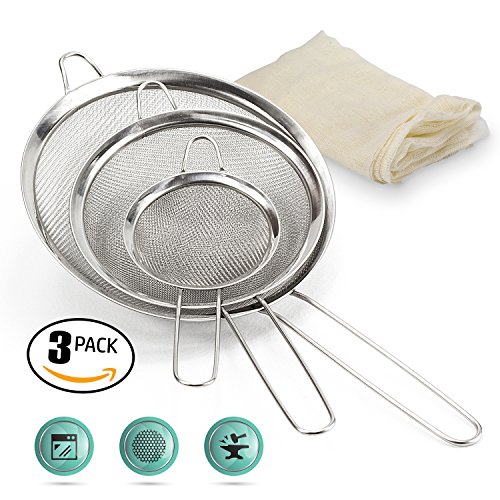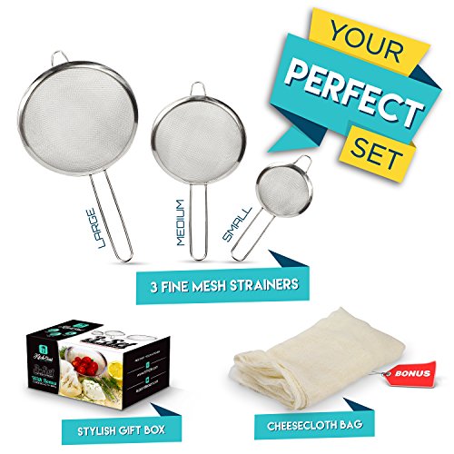 Fine Mesh Stainless Steel Strainer Set: 3 Food Strainers with Handles for Kitchen, Tea, Rice, Juice, and Other Uses plus Cheesecloth Bag