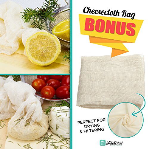 •FREE GIFT INCLUDED: Every KITCHSTART STRAINER SET comes with the 3 strong, reliable strainers in 3 various sizes plus a large Cheesecloth Bag for more refined purposes when draining, drying, filtering, or omitting excess liquids; the bag measures 10.82 by 5.5 inches; the complete set is perfect for chefs, cooks, and anyone that is in the kitchen; the set is an asset that will save time and effort
