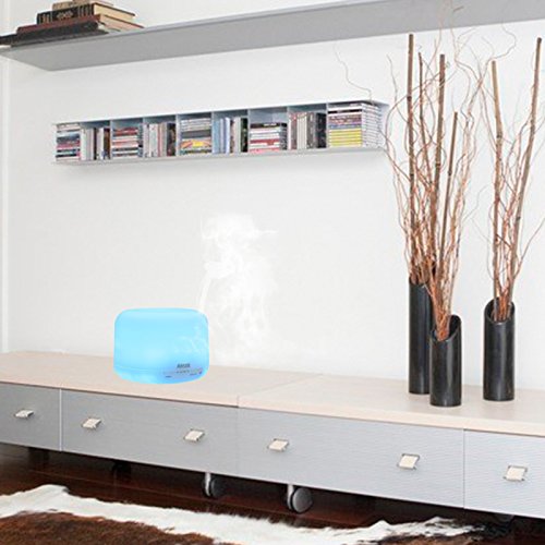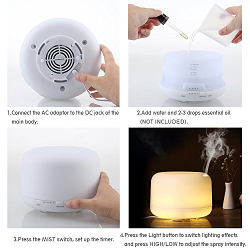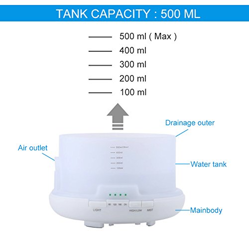 Description: This Aroma Diffuser uses Ultrasonic waves to instantly vaporize water and essential oil in the tank, to produce a cool, dry fragrant mist. The diffusion of natural oils offers safe and soothing ease to everyday health issues including stress, congestion, fatigue, memory recall, anxiety, and dry skin. 1.Mist Control Press the "Mist" button, choose the timer from 60 mins, 120 mins, 180 mins or ON. 2.Light Control Press the "Light" button to turn on the LED light, the color will change automatically. Press again to fix the color. And press again to change color. If you need to turn it off please long press the button for one second. 3.High/Low Control Adjust the spray intensity(strong or weak) Specifications: Water Capacity: About 500ML Timer: 60 / 120 / 180 minutes / On Size: 168*121mm Main Material: PP, ABS Weight: 520g Input: AC 100-240V 50/60Hz Output: DC24V 650mA Length of power line: 170cm Ultrasonic Frequency: 2.4 MHz - Advanced Ultrasonic Diffusing Technology LED Light: 7 pcs - Independent Light Control / Multiple Color Light / Gradual Changing or Fixed Mode or Off. Provides soft illumination Working Time: 8 hours in high mist mode and 17 hours in low mist mode. When time is up or there is no water, it will turn off automatically. Note: Please add water below the Max line Oil is not included in the package Package Contents: 1 x 500 ml Aroma Diffuser 1 x Charger Adaptor 1 x Measuring cup for filling water 1 x User ManualFeature