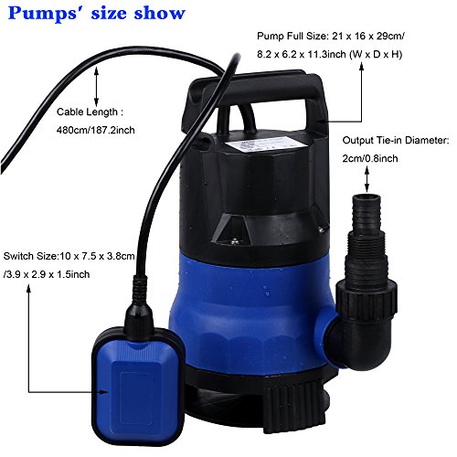- AUTOMATIC FLOAT SWITCH:The pump with a float switch can control start/stop Automatically.when the water level is below the initial level( ≤4.7 inch), it will automatically disconnect the power and stop working;When the water level rises above the initial level( >4.7 inch), the pump will start working automatically under the control of float switch.Notice:once the pump can not pump any water,the power must be cut off immediately.If not, that will lead to the coil inside the pump burned.