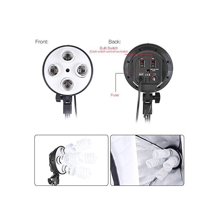 12 매45W프로의 사진 전구,5500k의 색온도,초높음 휘도,최적인 조명을 제공합니다.4in1밸브 소켓을 사용하면,하나의 소켓에 4개의 전구를 장치하는 것 를 할 수 있습니다.2개의 콘트롤 스위치를 사용하면,다른 밝기를 작성할 수 있습니다.