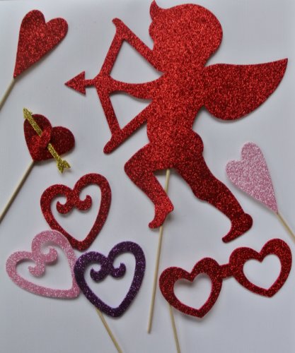 6 Pc Valentines Photo Booth Party Props Mustache on a Stick Bowler Hat Ladies Hat Mustaches Glasses so Cute Material Glitter Foamy