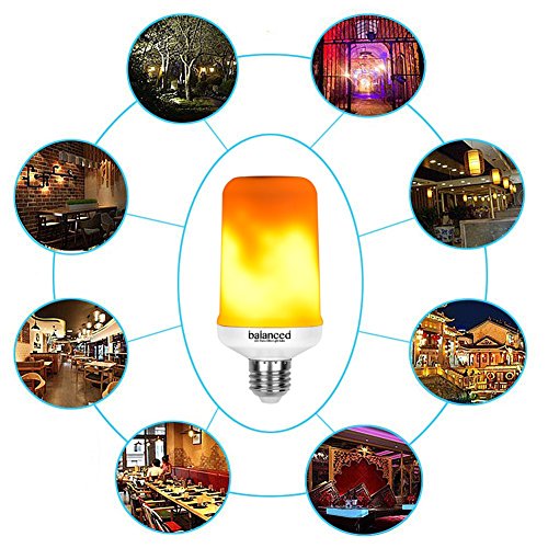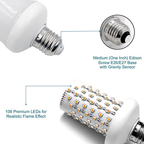 Perfect Flaming Light Bulb for a Romantic Valentine's Day! PRODUCT SPECIFICATIONS: Voltage: AC 85V-265V; Wattage: 4.5 Watts; Base: E26/E27 and is compatible with most lamps; Color: 1300K/1800K; LED Quantity: 108 Premium LEDs; Lifespan: 50,000 Hours; Bulb Size: 65*65*135 mm; Material: PC + ABS; Certification: CE Certified. USAGE RECOMMENDATION: To get optimal flame flickering performance, install this bulb in a frosted lampshade, lantern, salt lamp, etc. You can use it indoor or outdoor, e.g., a desk light, floor light, wall light, chandelier, crystal fixture, garden lights, sconces, etc.Feature