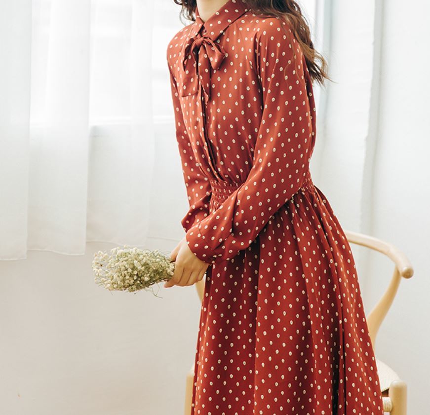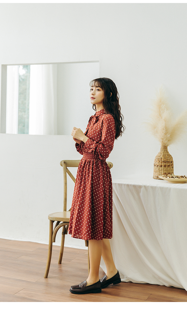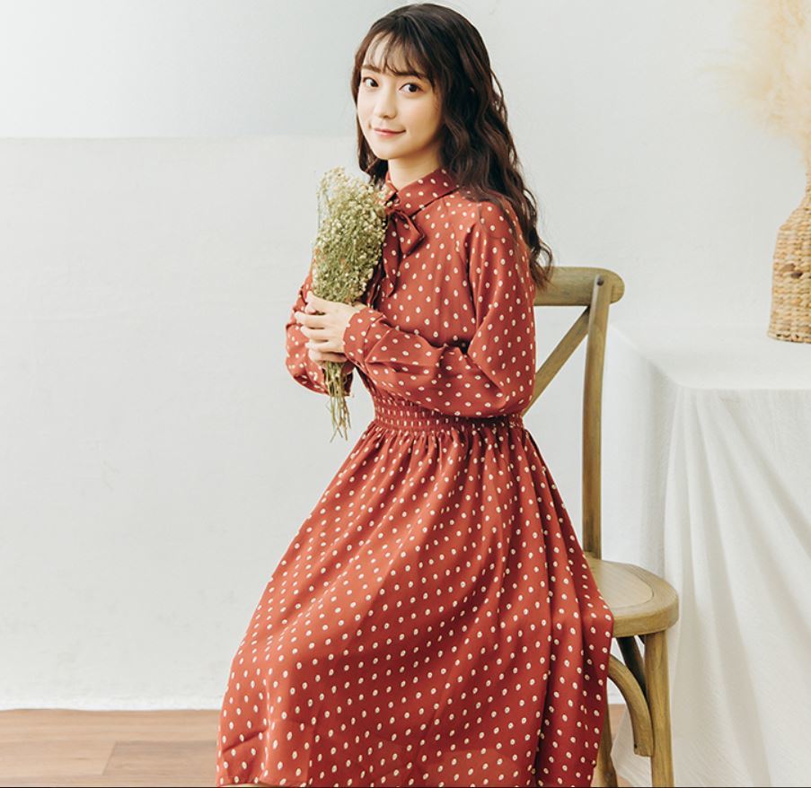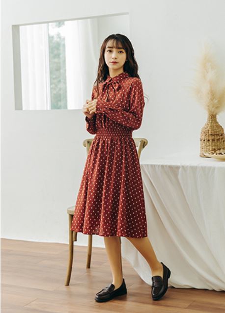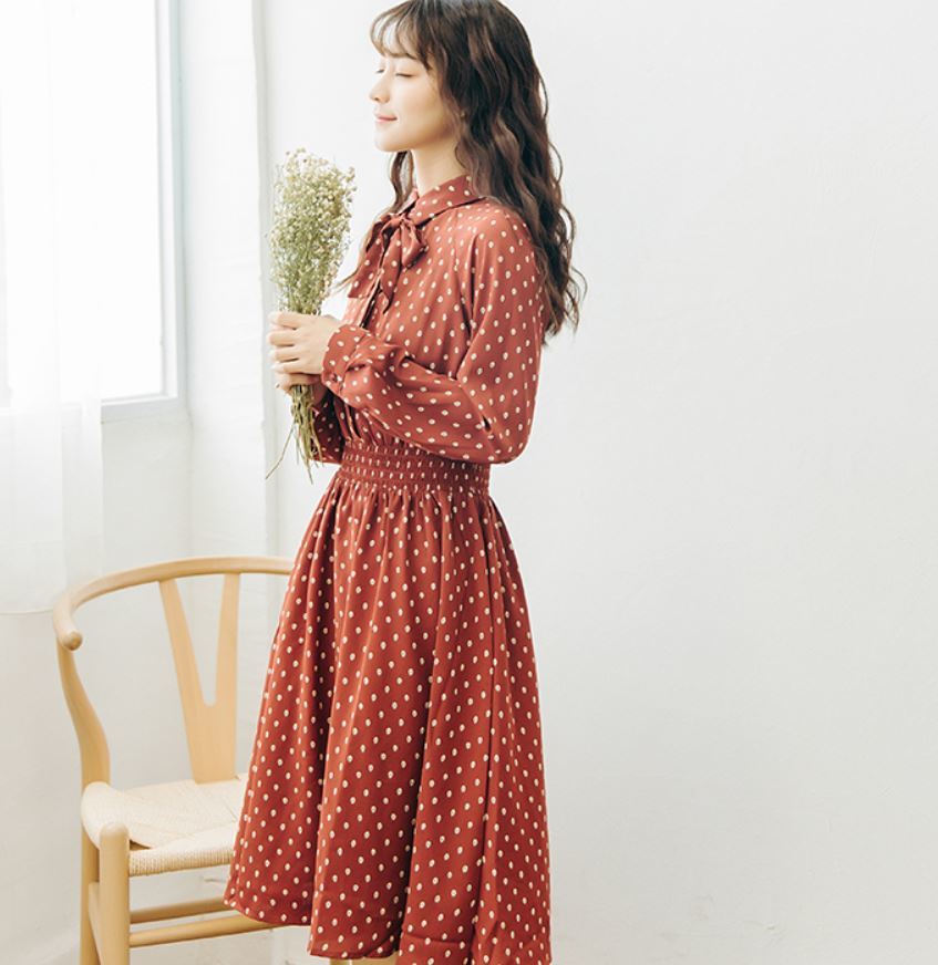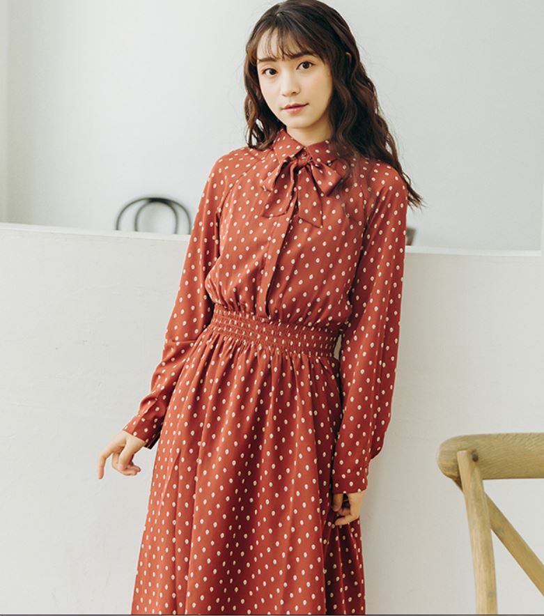 襟元のリボンがとってもガーリーなドット柄ワンピース♪