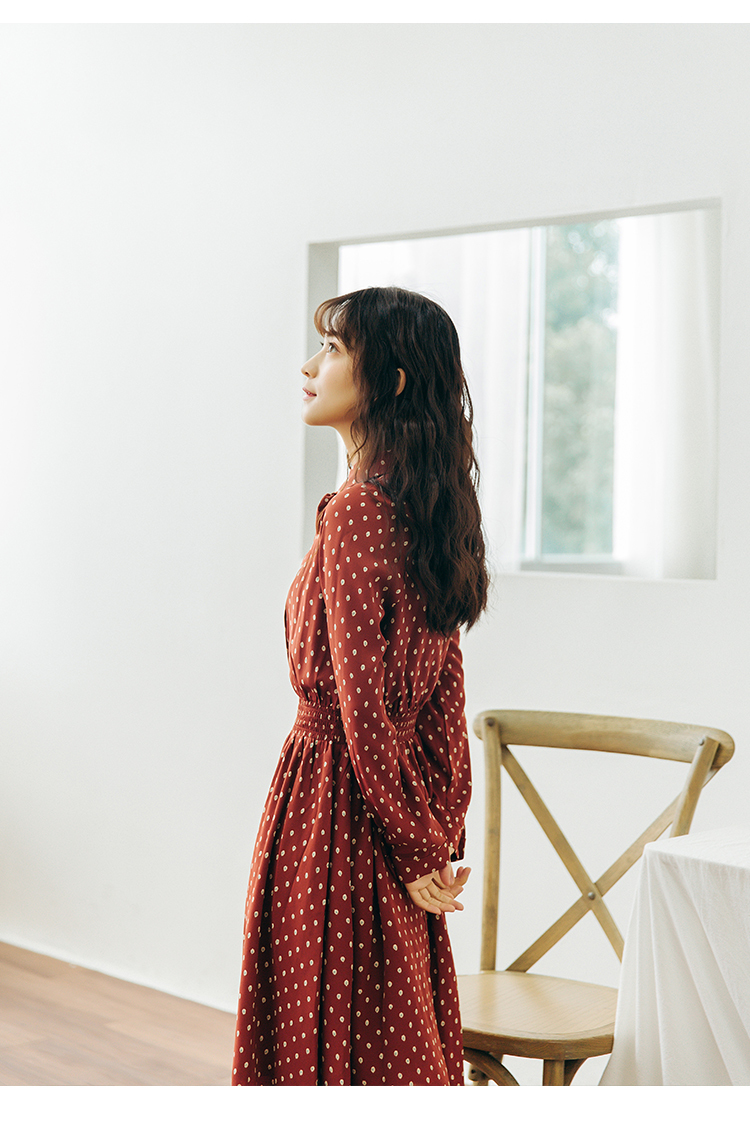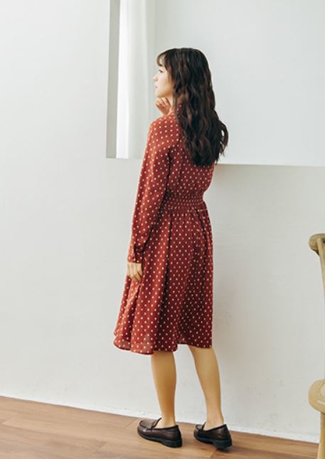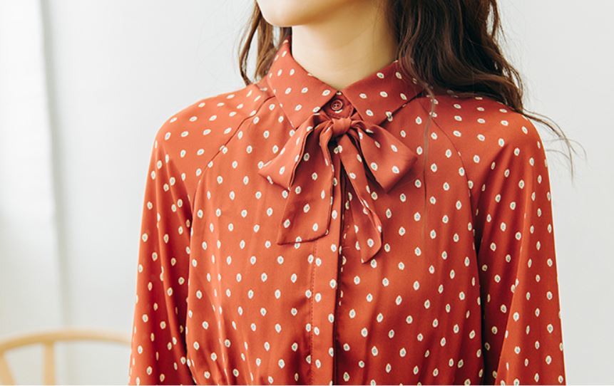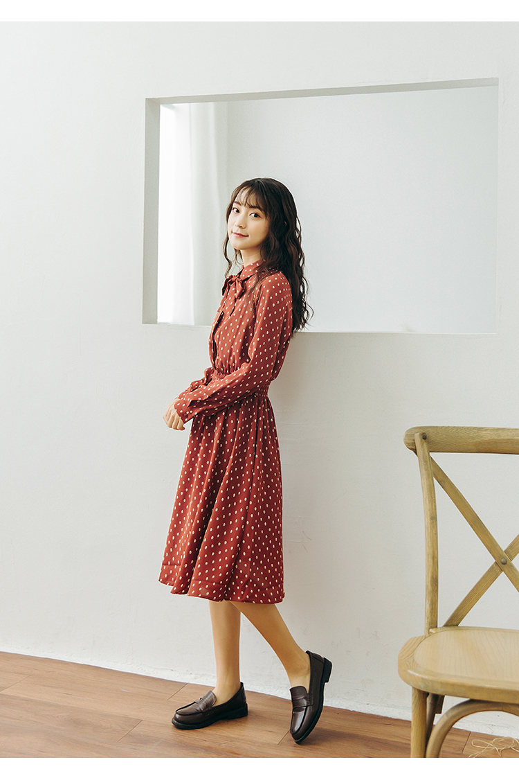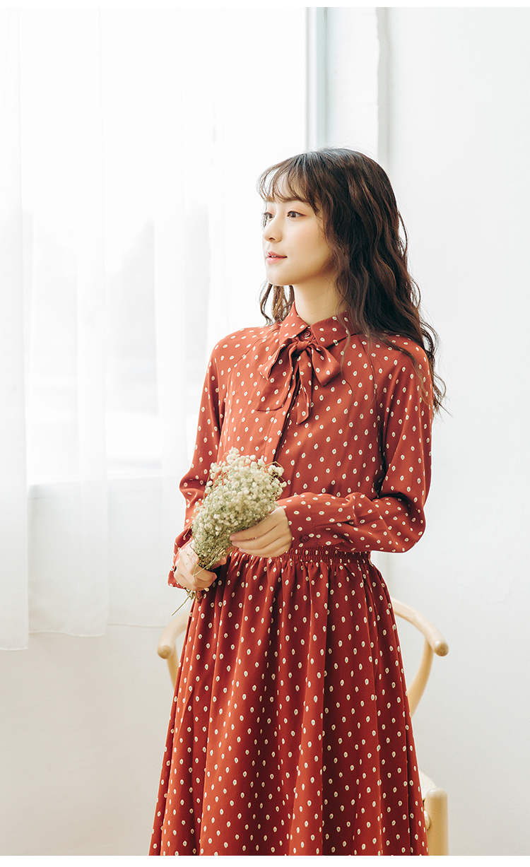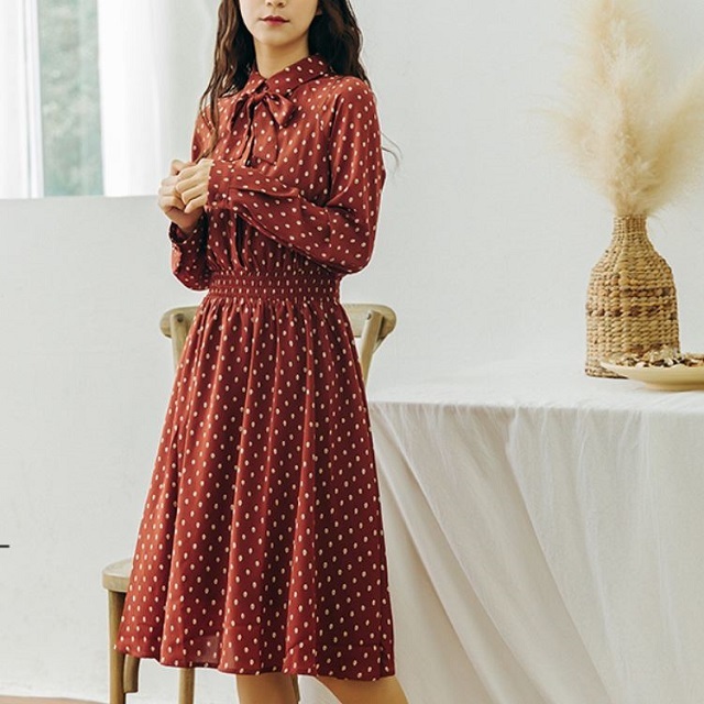 襟元のリボンがとってもガーリーなドット柄ワンピース♪