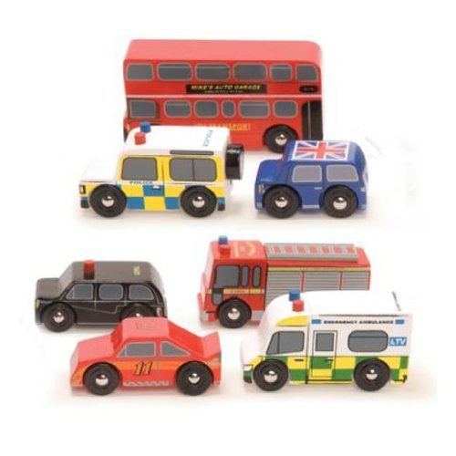 -. Feature : Set of 7 iconic British wooden vehicles / Compatible with wooden train tracks and wooden garage sets / Includes double-decker bus, police car, fire truck, ambulance, taxi, race car and car / Part of the Motors, Planes and Garages series