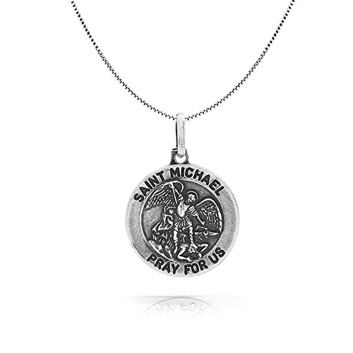 -. Feature : St Michael Pendant / .925 Sterling Silver / Pray for Us inscription / Measure: 0.75in diameter / 18 inch box chain