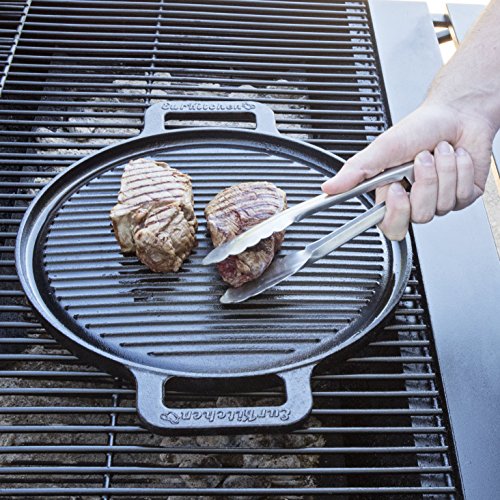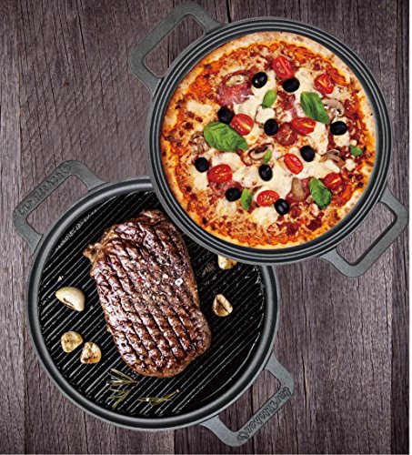 The ultimate in kitchen and grilling accessories You have countless pots and pans that serve just 1 function. They may work on the stove top, in the oven, or are strictly for grilling. The EurKitchen Pre-Seasoned Two-Sided Cast Iron Pizza, Griddle and Grill Pan tackles all your cooking tasks, on any cooking surface (including campfires) with one reversible, two-sided pan. Whether you want to grill vegetables, sear steaks or bake a pizza to perfection, this versatile pan is your go-to cookware. No pizza stone does all this. The EurKitchen Pre-Seasoned Two-Sided Cast Iron Pizza, Griddle and Grill Pan arrives pre-seasoned and ready to prepare healthy delights your family will salivate over. It cleans easily with a nylon brush, hot water and a light coating of oil.