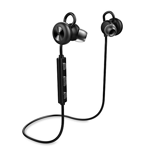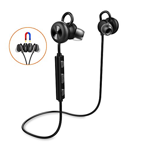 -. Feature : [BLUETOOTH V4.1 WIRELESS TECHNOLOGY WITH CVC 6.0 NOISE SUPPRESSION TECHNOLOGY]: Connect seamlessly with all Bluetooth enabled devices up to 33 feet away. Noise Cancelling / [WATERPROOF AND SWEATPROOF]: IPX4 water-resistant shell and internal nano-coating provide a double layer of water protection / [Ergonomic design]: High-end texture of the metallic shell and High quality wire rod. Lightweight design with customizable EarTips and InEar-Hooks give anyone a strong and comfortable fit. It is great for Gym, Running, Jogging, Hiking, Cycling, and impact Sports / [Long Battery life]: 1-2 hours recharge, 8 hours playing time, 250 hours standby time / [MAGNETIC]: Aluminum metal shells,Built-in magnets let you attach the two headphones together when not using, and wear like a necklace around your neck, no need to search for pockets to store it.