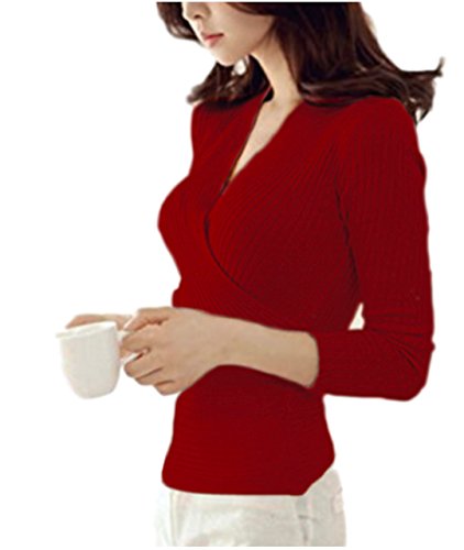 -. Feature : カシュクール(胸元で生地が交差するデザイン)仕様のスタイリッシュで凝ったデザインです。抜け感を出して、悪目立ちせずに大人の女性らしさと遊び心を演出。深めのVネックニットは、全身の着こなしをスッキリとした印象に見せてくれるので、パンツとのスタイリングもオススメ。 / リブニットで柔らかいストレッチ素材ですので大変着心地が良いです。伸縮性抜群で動きやすいストレッチの効いた素材だから、新世代ママにも重宝です。そんな魅力がたくさん詰まったVネックが施された、Vネックニットはカラダのラインがキレイにキマるシルエットなので、男性ウケ抜群のアイテムでデートコーデにも優れたアイテムでもあります。 / また、Vネックニットのトップスはいろいろなボトムスにも合わせやすいので、若い女性だけでなく幅広い年齢層の人たちから、ウケが良いのです。サイズはフリーサイズになります。ご参考までに:着丈49cm,バスト68-80cm,袖丈46cm / Vネックのデザインはシンプルな上に、小顔に見せてくれるところもVネックの魅力です。小顔に見えることが期待できるだけでなく、スタイリッシュな雰囲気を醸し出すことも期待できます。 またトップスにデザイン性のあるものを持ってくることで、上に目線を持っていくことができるので、背が高くすらっとした印象を与えることができるのです。シンプルなタイトシルエットのリブニットトップスですので 暗くなりがちな秋冬のような肌寒い日のコーディネートをインナーで自在な印象に。 / いつだって決めすぎない、余裕のあるスタイルが“優しげ見え”成功のコツ。 デコルテを美しく見せるVネックが可愛らしくもあり、セクシーさを演出します。タックが入ったスティックパンツと深めのVネックニットを合わせる場合には、差し色になるような鮮やかカラーを選ぶと良いです。また他のアイテムをダークトーンでまとめれば、差し色がより際立って、お肌の色も綺麗に見せてくれます。